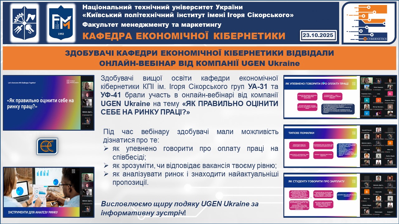 23.10.2025 р. Здобувачі вищої освіти кафедри економічної кібернетики КПІ ім. Ігоря Сікорського груп УА-31 та УФ-41 брали участь в онлайн-вебінарі від компанії UGEN Ukraine на тему «ЯК ПРАВИЛЬНО ОЦІНИТИ СЕБЕ НА РИНКУ ПРАЦІ?»